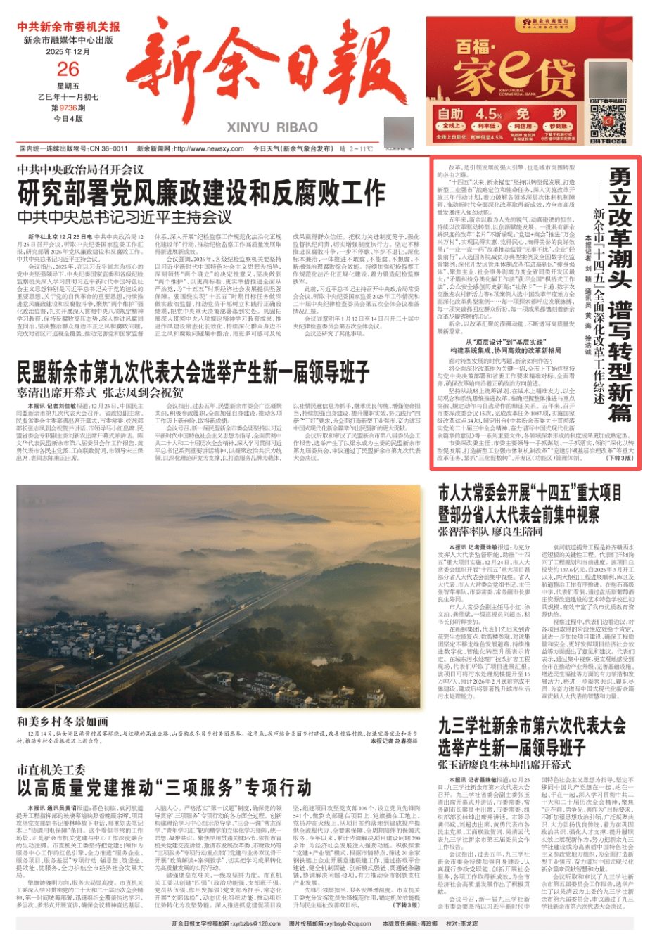 12月26日,新余日报以“怯立潮头 谱写转型新篇”为题,专题报道了“十四五”期间我市全面深化工做成绩,现将全文转载如下。